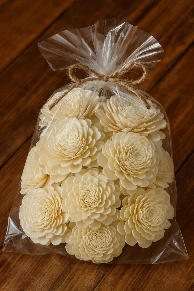 • Sola flowers are made of natural fabric obtained from manioc. Its starch is processed into flakes, from which petals and other parts are cut and then are joined with wire or thread. The material is soft and very flexible.