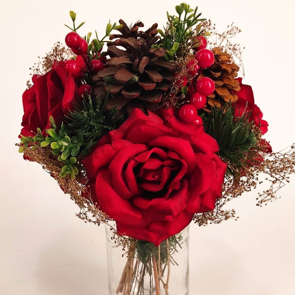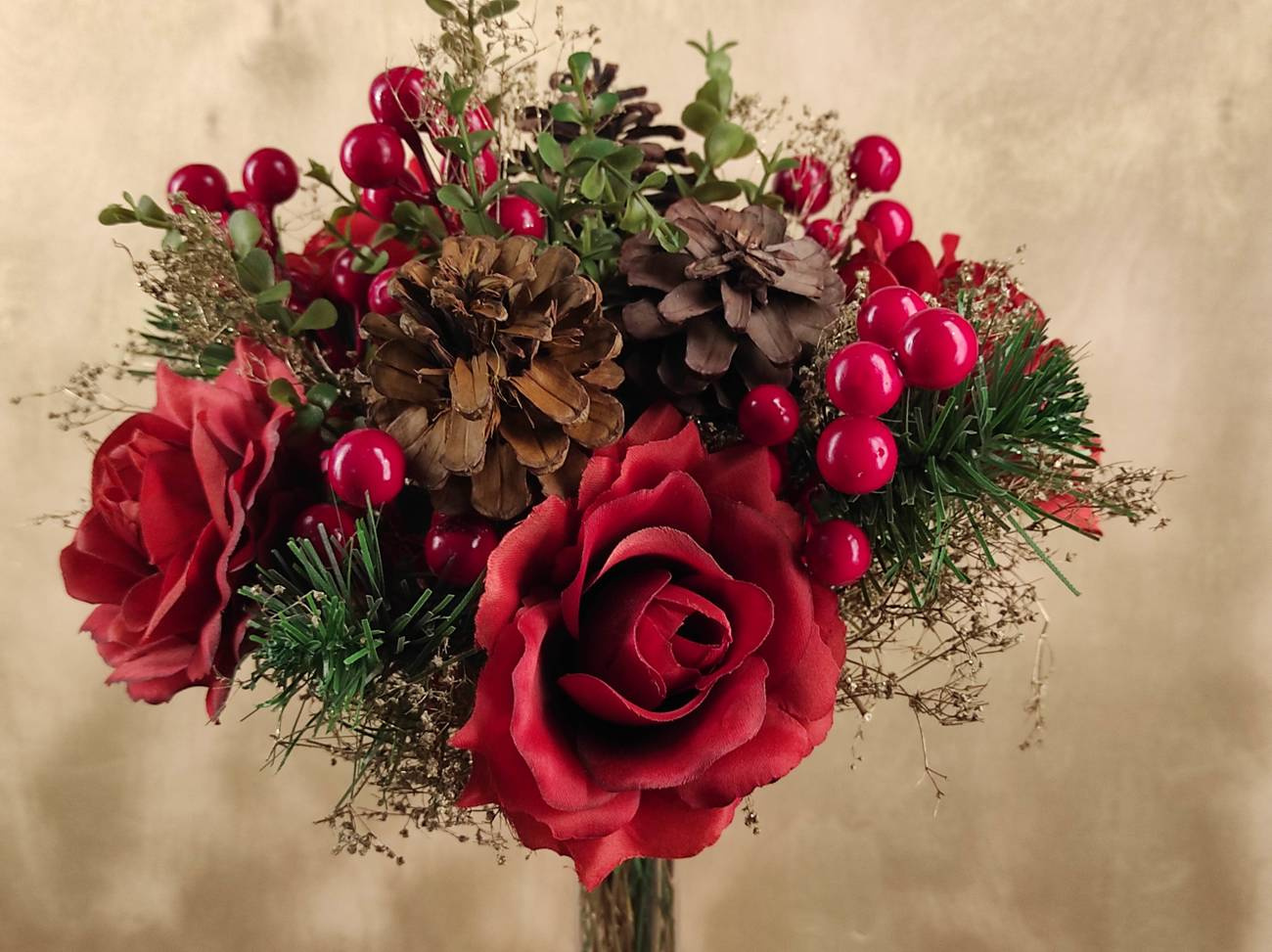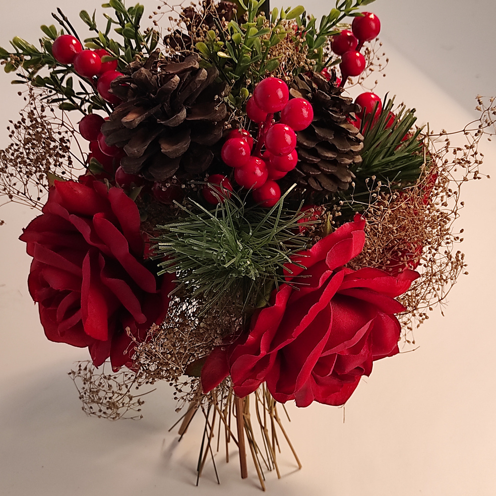 • Künstliche Blumen Rosen - schöner Strauß Rosen. Blütenstiele mit einem Band beendet. Der Blumenstrauß ist ähnlich wie der Hochzeitsstrauß gemacht. Satinrosen und natürliche Accessoires verschmelzen zu einem eleganten Bündel. Höhe 45, Durchmesser 45 cm