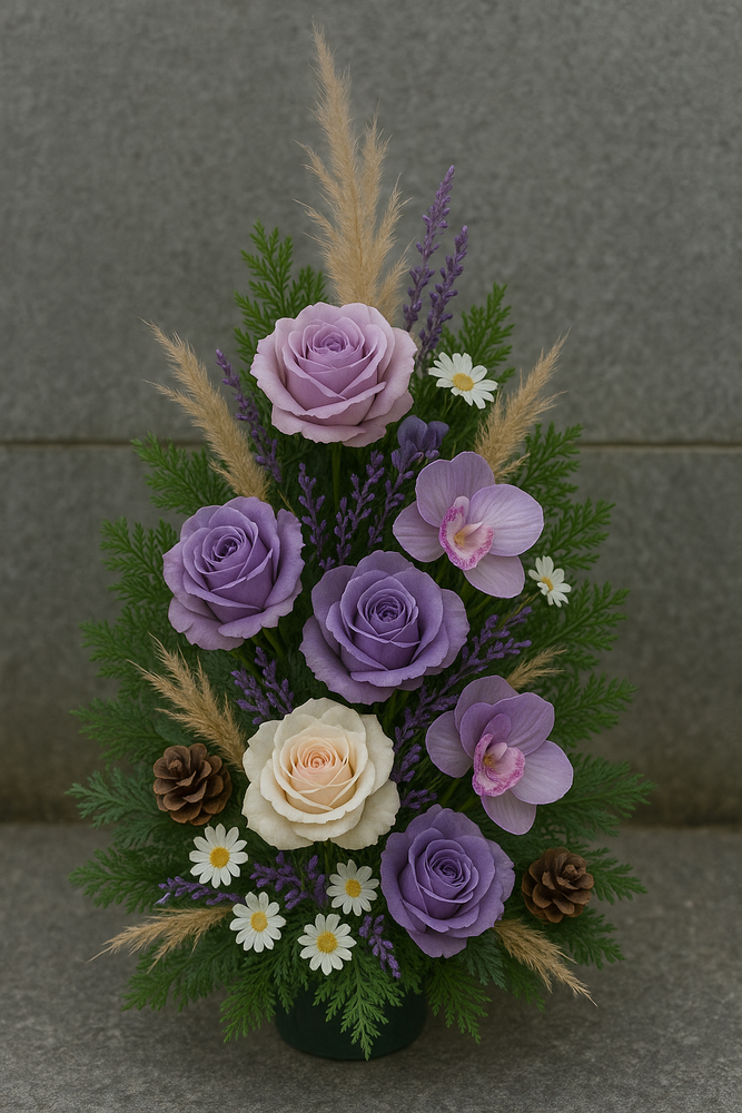 • Reed, Komposition für All Saints. Künstliche Chrysanthemen auf einem Kegelkranz, Preis für eine Grabsteindekoration von 35-40 cm Durchmesser, Künstliche Blumen in Lila. Blätter für den Friedhof können das ganze Jahr über gekauft werden.