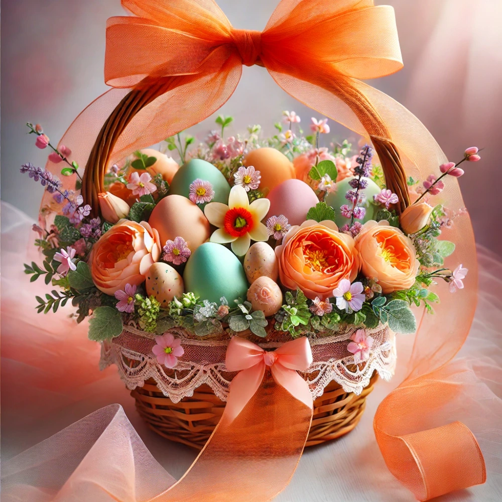 pięknie udekorowany koszyk wielkanocny z pomarańczowym tiulem (12 cm), delikatnie przewiązanym w kokardę. Koszyk ozdobiony jest pastelowymi pisankami, świeżymi wiosennymi kwiatami i koronkowymi akcentami, nadając mu świąteczny i elegancki wygląd
