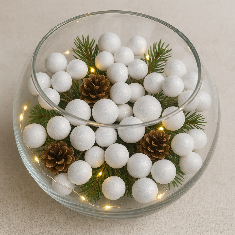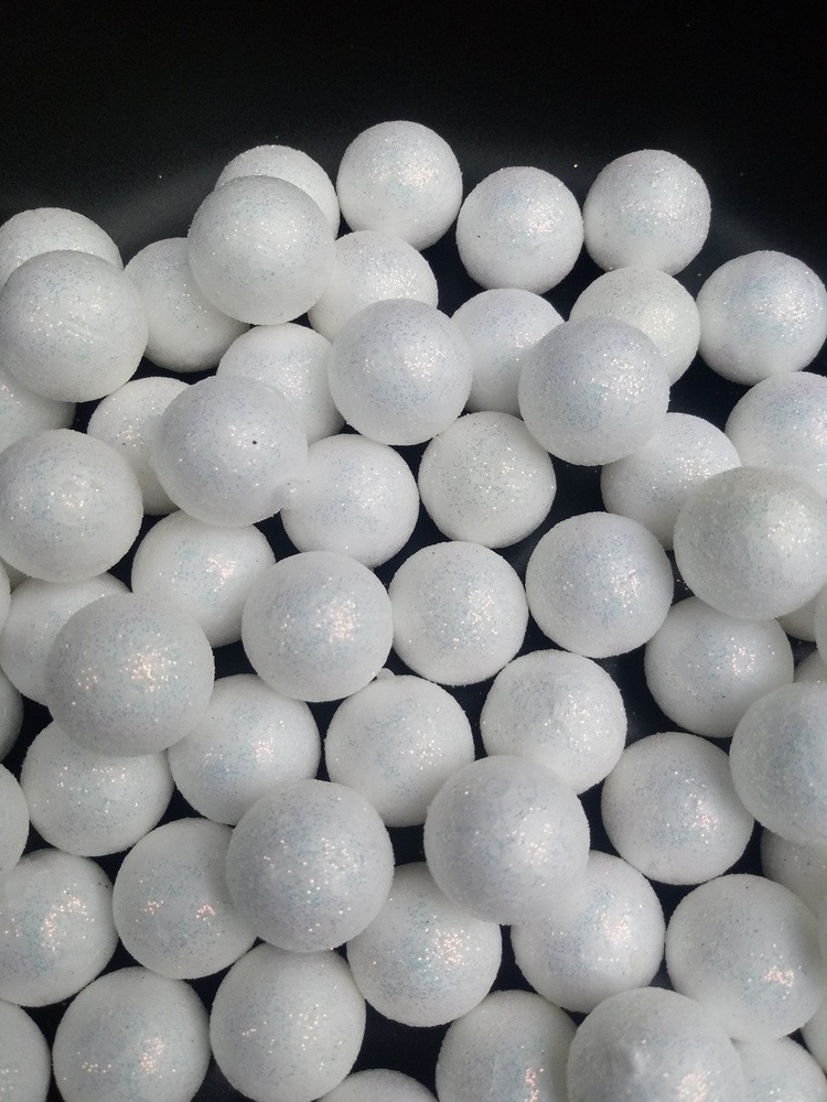 Białe kuleczki tworzą efekt „śniegu w bombce”.