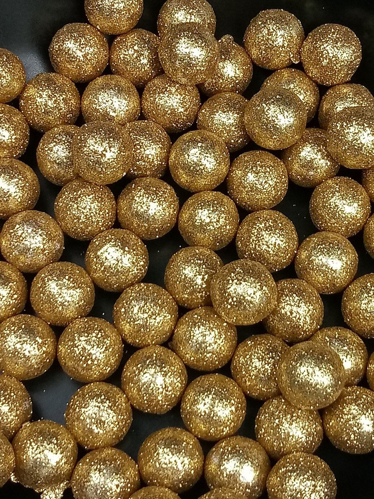 Tip: Połącz złote kuleczki z białymi elementami (gwiazdki, bawełna) – uzyskasz elegancki, jasny efekt glamour.