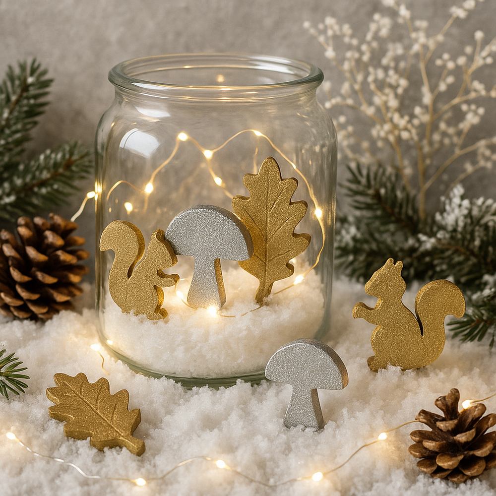 Wsyp trochę śniegu, dodaj kilka szyszek i 2–3 figurki. Całość oświetl drucikiem LED. Efekt: elegancka dekoracja na stół lub parapet.