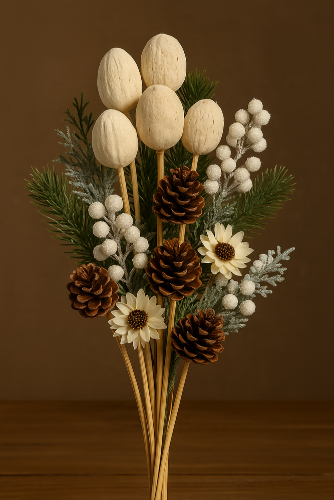 Każdy orzech jest umieszczony na solidnym drewnianym piku, co ułatwia jego mocowanie w stroikach, bukietach, wiankach lub gąbkach florystycznych.