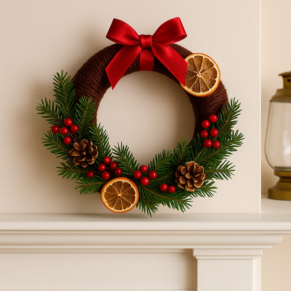 Dekoracja kominkowa lub ścienna – powieś na wstążce, dodaj drobne światełka microLED.