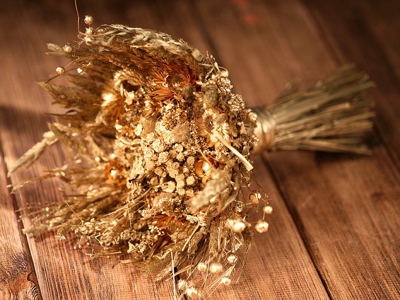 Dekoracja świąteczna do wazonu - Bukiet suszonych ziół w złocie to wyjątkowa ozdoba, która łączy w sobie naturalne piękno i elegancję. Bukiety te składają się z ręcznie zbieranych ziół, gipsówki oraz traw, barwionych na złoto, tworząc unikalną i trwałą kompozycję, która będzie idealnym elementem wystroju wnętrz w okresie świątecznym.