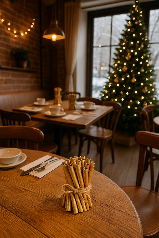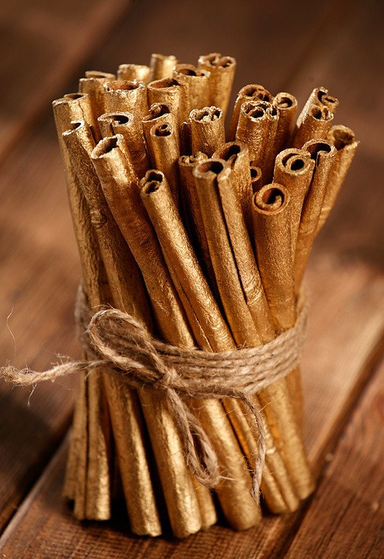 Każdy snopek składa się z ok. 40 lśniących lasek cynamonu, malowanych na złoto i przewiązanych jutowym sznurkiem – gotowych do użycia od razu po wyjęciu z opakowania.