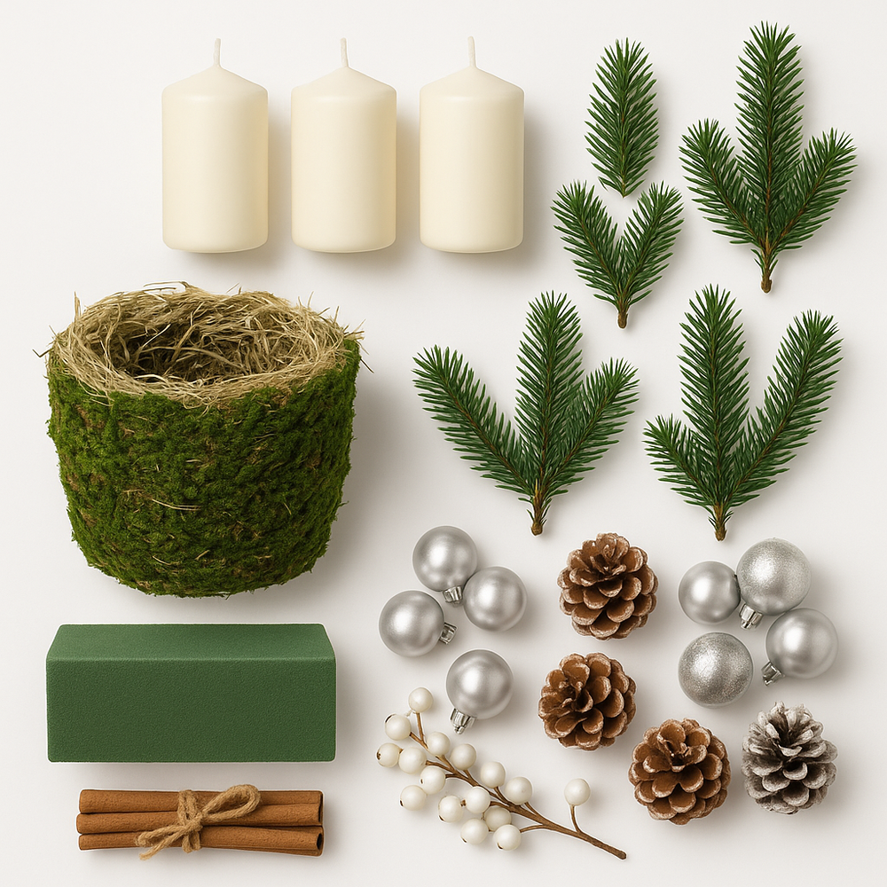 Otrzymasz elegancki, zimowy stroik, idealny na parapet, stół świąteczny lub jako prezent.