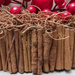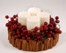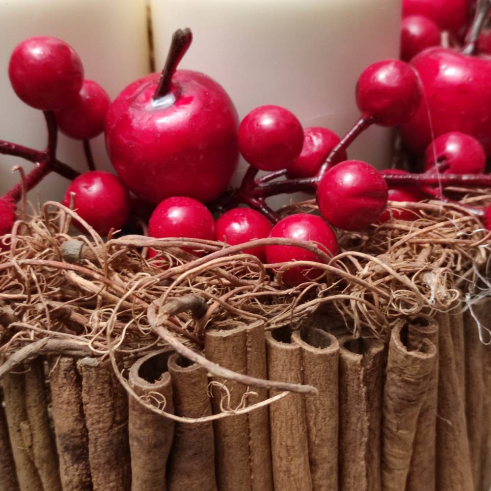 dekoracje: czerwone owoce, gałązki, laski cynamonu