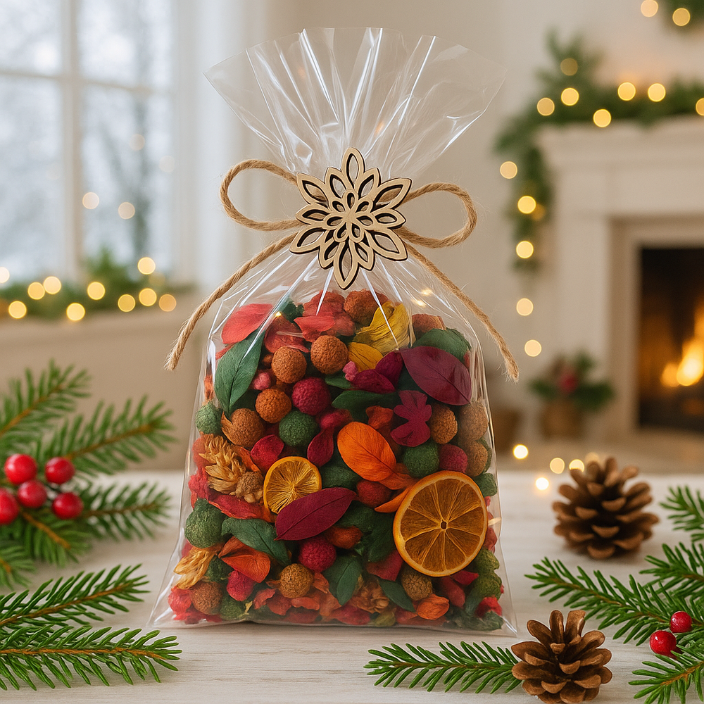 Kompozycja składa się z różnorodnych suszonych elementów – kolorowych liści, owoców, roślin i dodatków – tworząc żywą, wielobarwną mozaikę idealną na czas świąt.