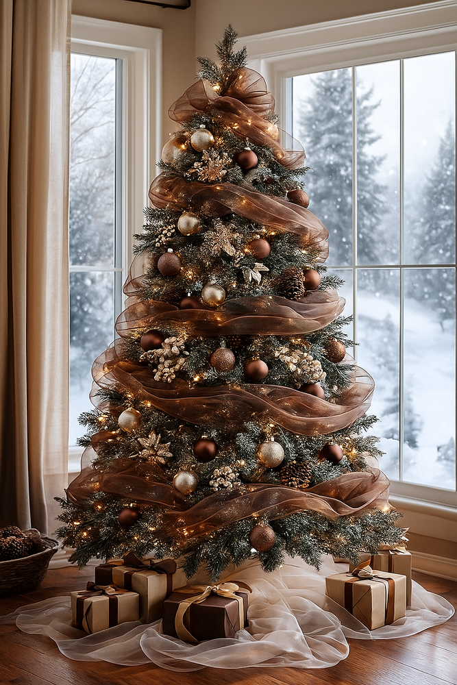 Rozłóż warstwę kremowej organzy pod drzewkiem zamiast klasycznej spódnicy – wygląda jak śnieżna mgiełka na podłodze.