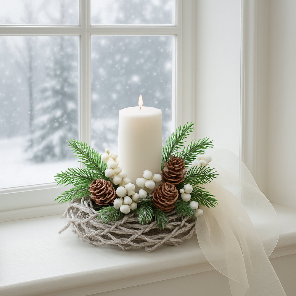 Owiń świecę tiulem, dodaj szyszki i gałązki – bez kleju, tylko na supeł.