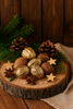 Część orzechów jest w kolorze naturalnym, część w wersji złotej – całość tworzy elegancką kompozycję w stylu boho, eco, rustykalnym lub glamour w zależności od sposobu użycia.