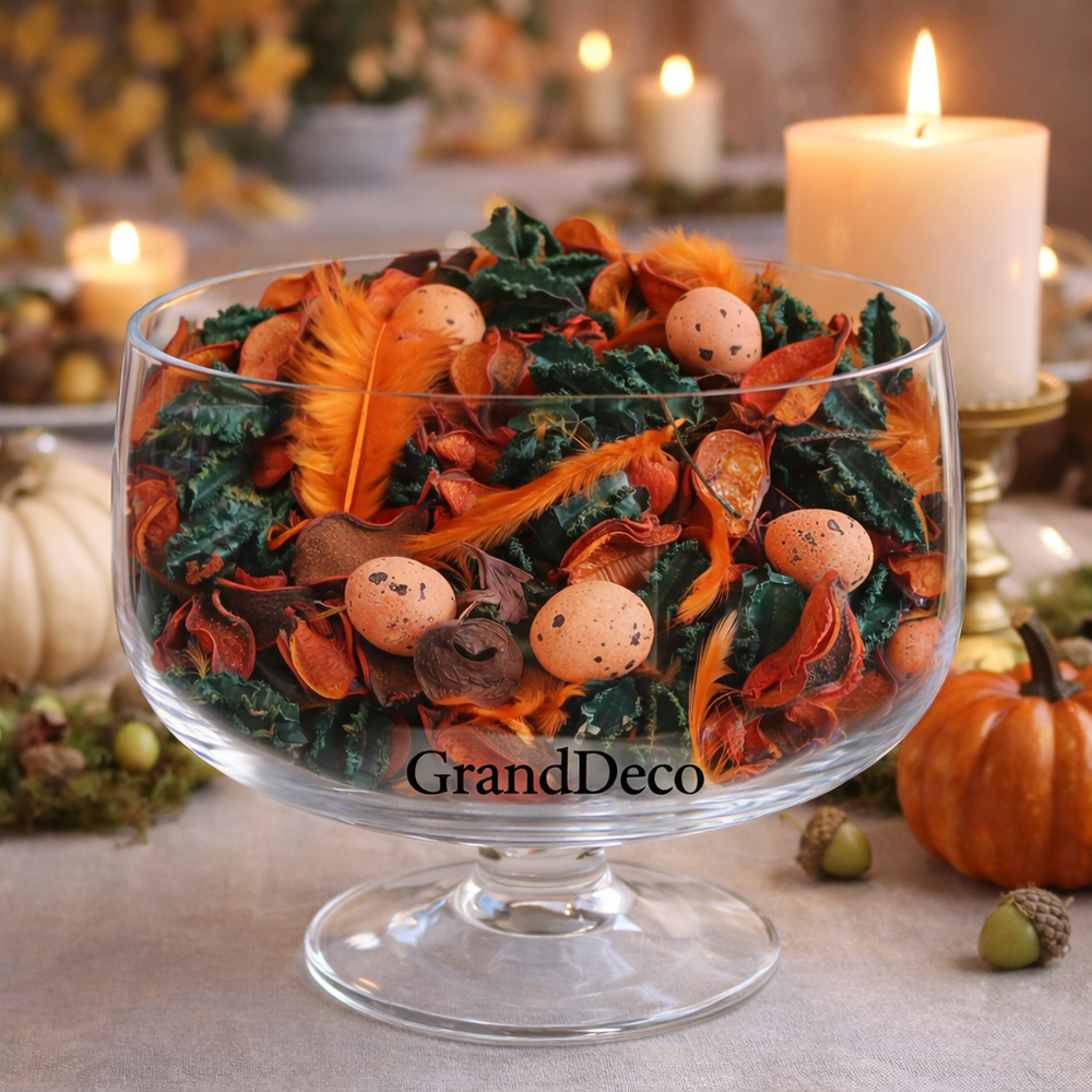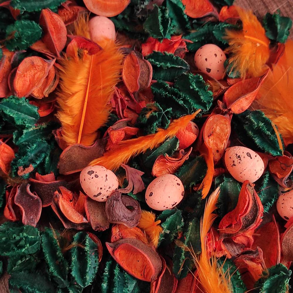 Mieszanka zawiera ozdobne jajeczka, które podkreślają świąteczny charakter, delikatne pióra, nadające lekkości, a także suszone łuski i liście, które wprowadzają strukturę i naturalny wygląd. Kolorystyka w odcieniach pomarańczowo-zielonych sprawia, że dekoracja doskonale wpisuje się w wiosenny klimat Wielkanocy.