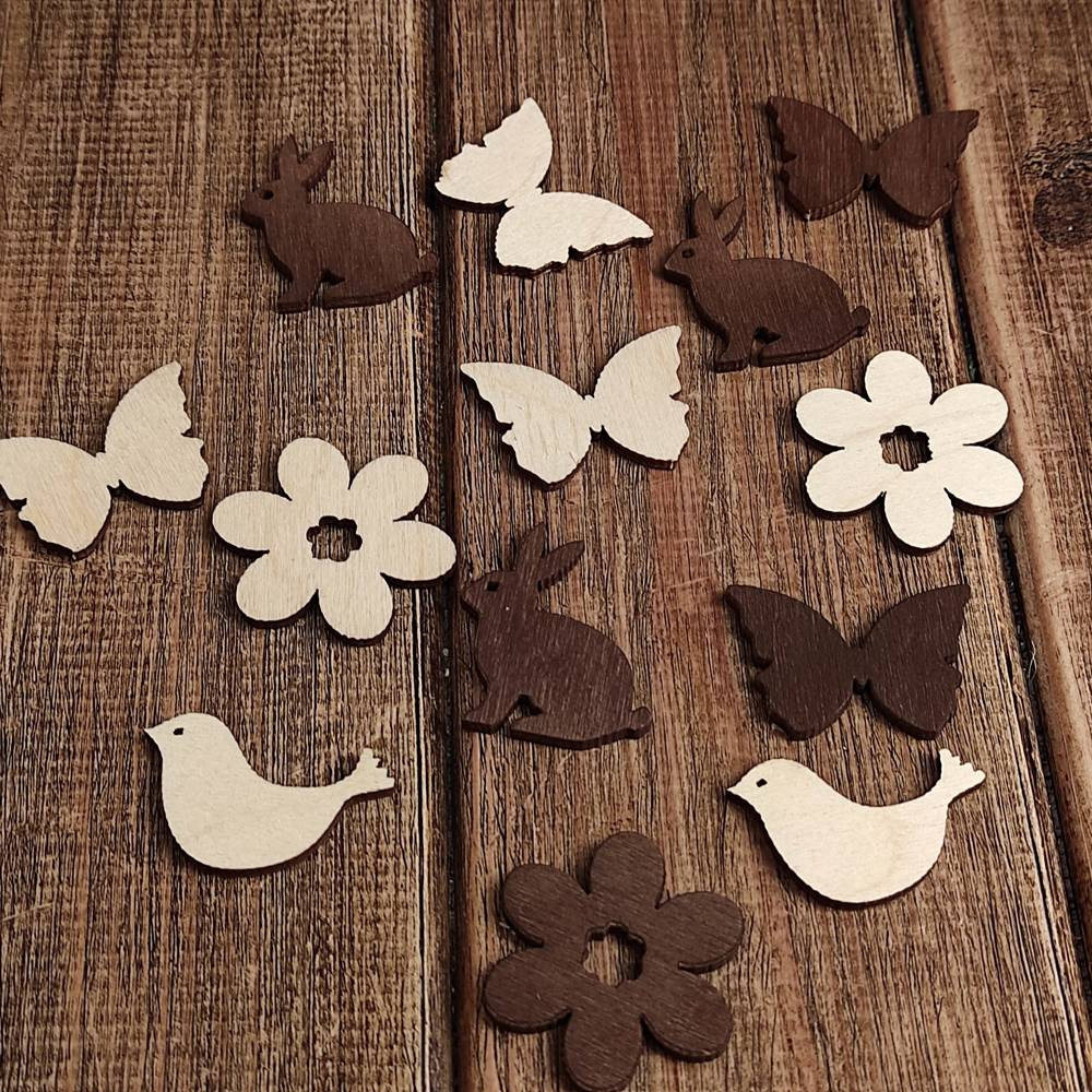 Naturalny zestaw 48 drewnianych ozdób w odcieniach jasnego i ciemnego drewna. Motywy: zajączki, ptaszki, motylki oraz kwiaty. Idealne do dekoracji wielkanocnych, rustykalnych kompozycji i kreatywnych projektów DIY.