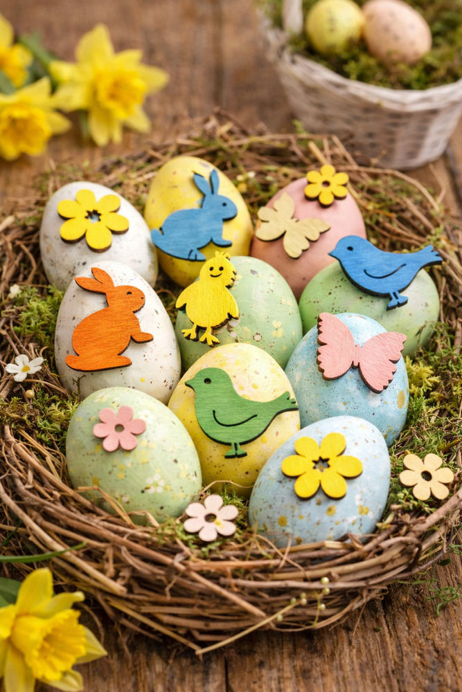 Kolorowy zestaw 48 drewnianych ozdób w rozmiarze 2–3 cm. Motywy wiosenno-wielkanocne: zajączki, kurczaczki, ptaszki, motylki, kwiatki oraz serduszko. Wszystkie kolory wymieszane w jednym zestawie – pastelowe i intensywne odcienie tworzą radosną kompozycję.