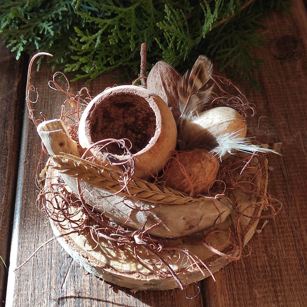 Stroik wykonany ręcznie na suszonym plastrze drewna o średnicy 12-15 cm. W tej naturalnej kompozycji znajdziesz suszone zboże, korzonki z Ameryki i Azji, łupinki bell cup, mech, egzotyczne piórka oraz unikalne jajeczka amry. Wszystkie elementy zostały starannie dobrane, aby stworzyć wyjątkową dekorację na Wielkanoc 2025. Stroik idealnie sprawdzi się jako prezent dla miłośników rustykalnego stylu i naturalnych dodatków. Oferuje nie tylko piękno ręcznie wykonanej pracy, ale także wprowadza wiosenny nastrój do każdego wnętrza.