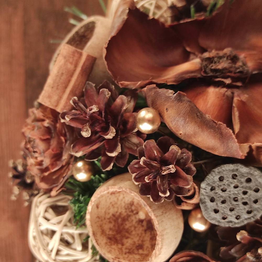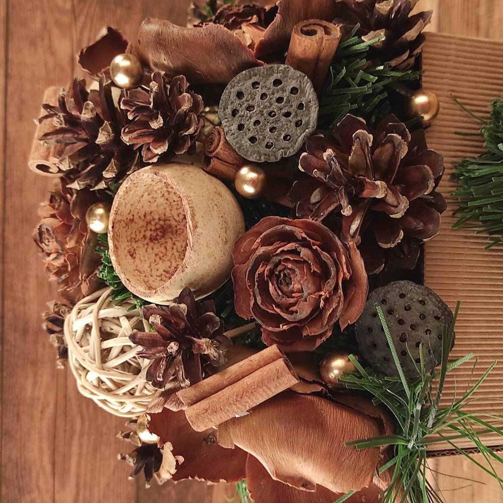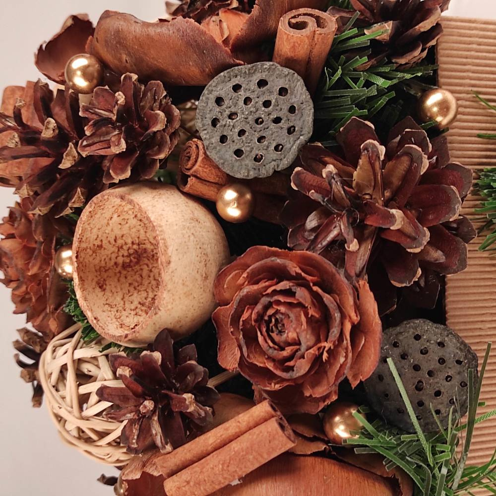 materiały: szyszki, cynamon, suszone owoce, mech, rattan, gałązki iglaste