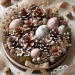wielkanocna kompozycja z małymi brązowymi szyszkami o białych brzegach, udekorowana naturalnymi elementami