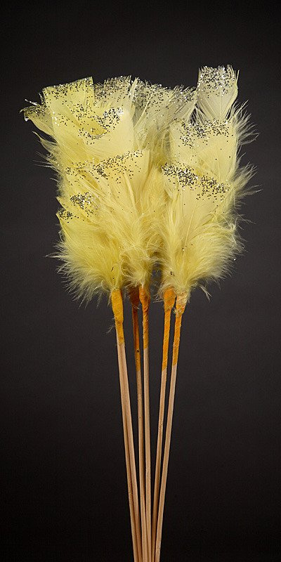 Drewniane piki z brokatowymi piórami w jasnożółtym kolorze świetnie komponują się w świątecznych aranżacjach stołowych. Można je umieścić między światełkami, świecznikami lub kwiatami, aby dodać elegancji i blasku. Ich lekkość i połysk doskonale współgrają ze świątecznym klimatem, rozświetlając stół w ciepły, subtelny sposób.