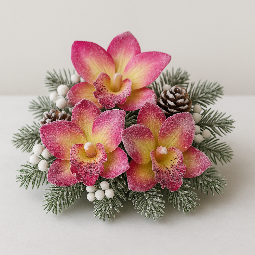 Połącz 2–3 główki storczyka z ośnieżonymi gałązkami, szyszkami i białymi kuleczkami. To idealna dekoracja na świąteczny stół lub komodę.