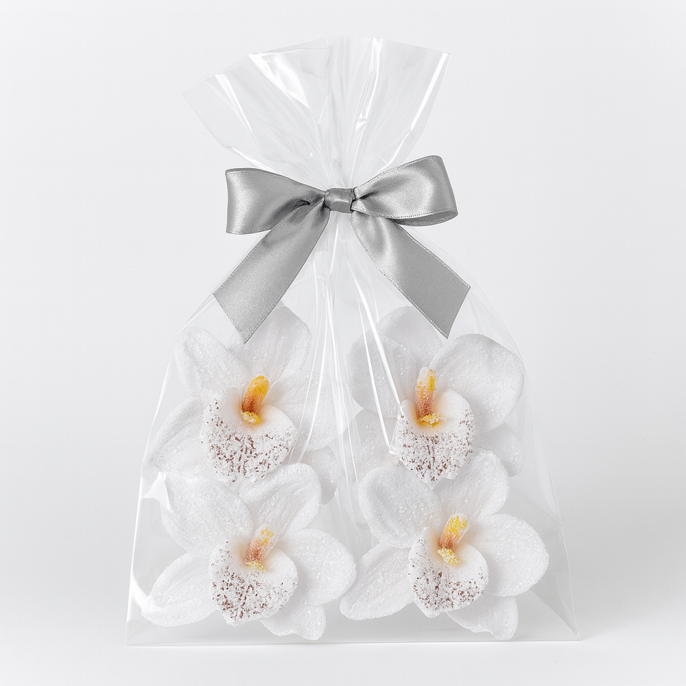 Kwiaty mają elegancki, śnieżny połysk, który pięknie podkreśla ich subtelną formę i naturalne detale – od delikatnie pofalowanych płatków po charakterystyczne nakrapiane środki. Ośnieżone wykończenie nadaje storczykom wyjątkowy zimowy, lekko luksusowy charakter, idealny do świątecznych i zimowych aranżacji.