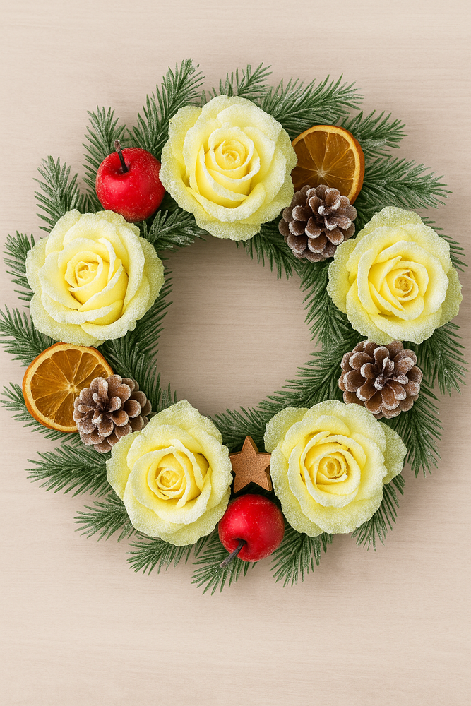 Ozdobna powłoka szronu jest subtelna – nie przesadza, lecz dodaje wyrazistości i elegancji. Kolor żółty w tej tonacji jest spokojny, kremowo-pastelowy, przez co całość tworzy delikatny, luksusowy efekt.