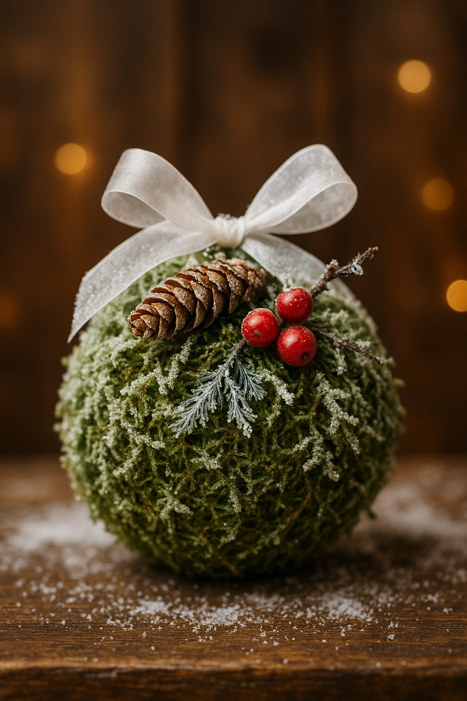 Urocza, ręcznie wykonana kula z naturalnego mchu leśnego, delikatnie oszroniona, z ozdobną kokardką, szyszką i ministroiczkiem. To wyjątkowa dekoracja w stylu rustykalnym i świątecznym, która wnosi do wnętrza ciepło natury i przytulny, zimowy klimat.