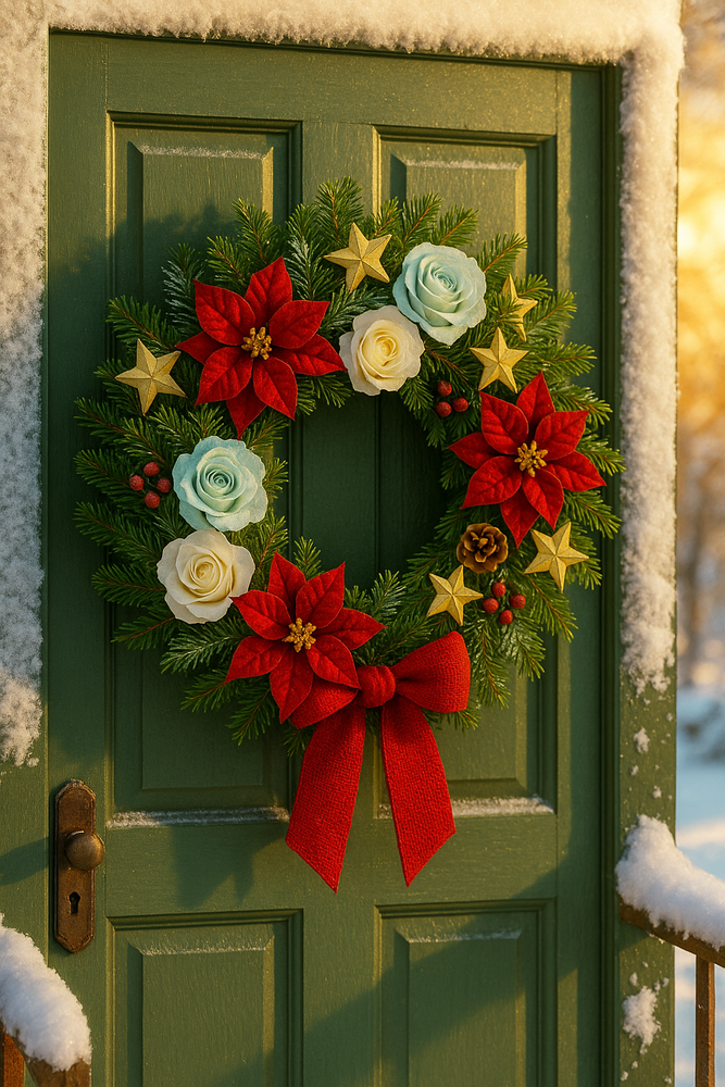 Połączenie czerwonych gwiazd betlejemskich z kremowymi i błękitnymi różami tworzy oryginalną, elegancką kompozycję. Jutowa kokarda i naturalne szyszki dodają wiankowi ciepła i autentycznego, świątecznego charakteru. To dekoracja, która wprowadzi do wnętrza magiczny klimat Bożego Narodzenia.