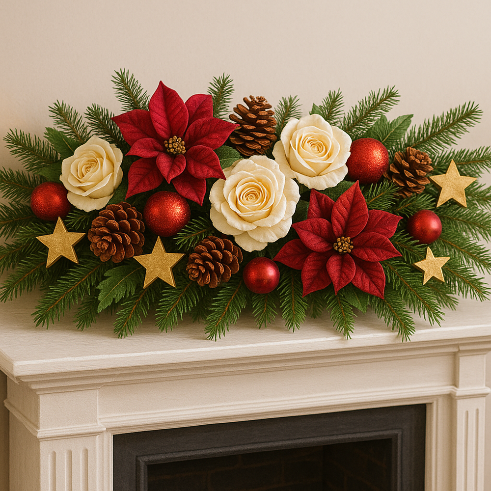 Połączenie czerwonych i kremowych kwiatów z żywym igliwiem tworzy wyjątkowo ciepłą i elegancką kompozycję świąteczną. Szyszki i gwiazdki podkreślają naturalny charakter dekoracji, a świeże igliwie wprowadza do wnętrza zapach lasu i świąteczny nastrój.