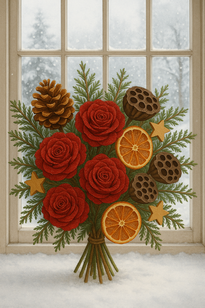Bukiet z mieszanki tui i świerku w połączeniu z czerwonymi różami i złotymi dodatkami to harmonijna kompozycja natury i elegancji. Szyszki, lotosy i gwiazdki dodają mu świątecznego uroku, a świeże igliwie wypełnia przestrzeń pięknym zapachem lasu.