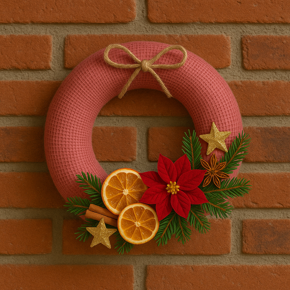 Połączenie czarnej juty z naturalnymi dodatkami i ciepłymi barwami Świąt tworzy harmonijną, przytulną dekorację. Wianek pachnie pomarańczą, cynamonem i anyżem, wprowadzając do wnętrza wesoły klimat Bożego Narodzenia.