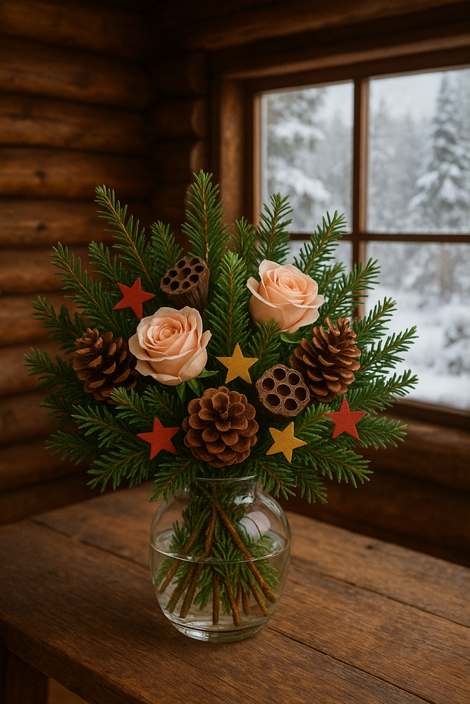 Bukiet z iglastych gałązek, szyszek i kolorowych gwiazdek to radosne połączenie natury i świątecznego nastroju. Lotosy i róże nadają elegancji, a drewniane elementy wprowadzają przytulność i ciepło. To dekoracja, która zachwyca prostotą i naturalnym urokiem.