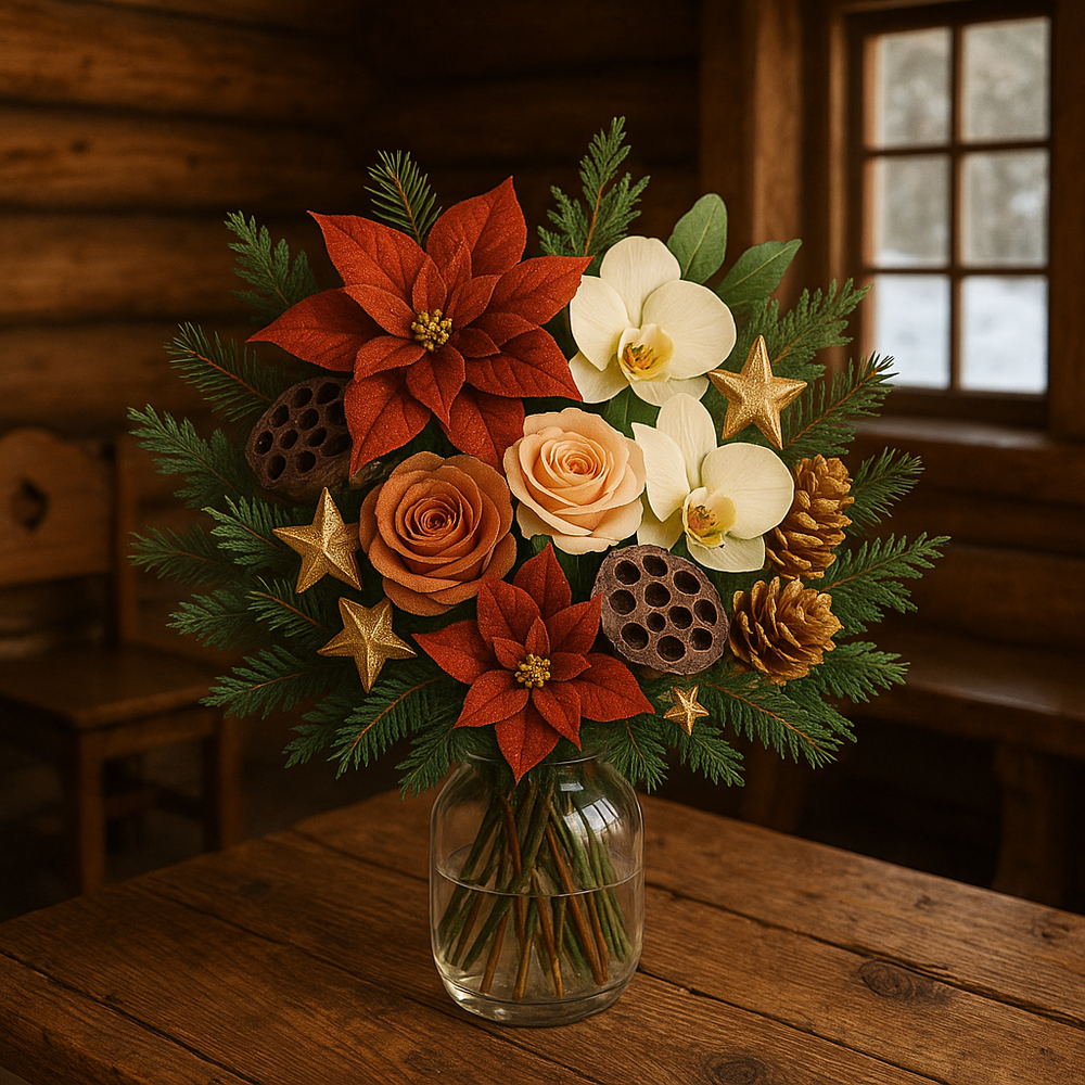Ten bukiet to esencja świątecznej elegancji. Połączenie czerwonych i kremowych kwiatów z naturalnym igliwiem i złotymi akcentami tworzy ciepłą, luksusową i harmonijną dekorację. Szyszki i lotosy dodają naturalnego uroku, a storczyki i róże wnoszą nutę subtelnego wyrafinowania. To ozdoba, która podkreśli magiczny klimat Świąt Bożego Narodzenia.