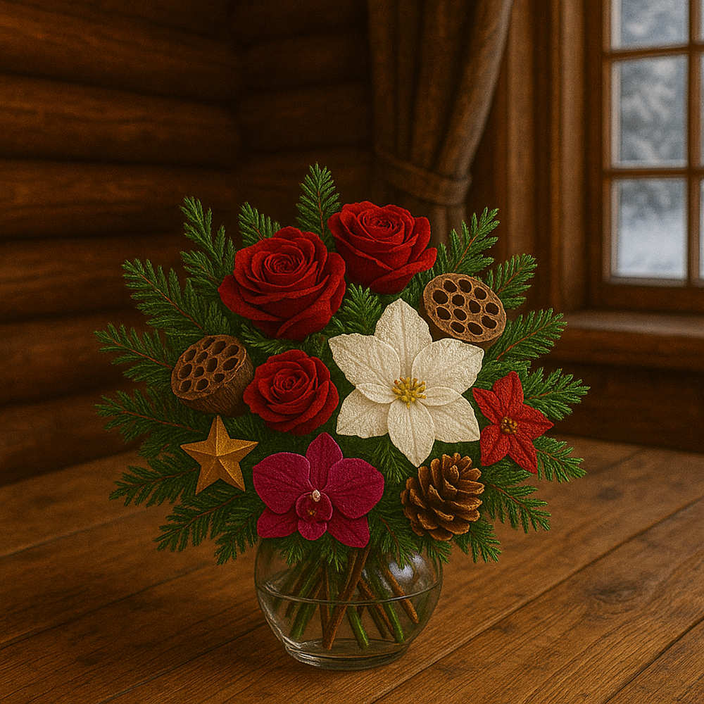 Ten bukiet to harmonia świątecznych barw i naturalnych materiałów. Połączenie czerwonych i białych kwiatów z zielenią igliwia symbolizuje radość, spokój i magię Świąt Bożego Narodzenia. Lotosy i szyszki dodają mu naturalnego uroku, a całość zachwyca świeżością, elegancją i ponadczasowym stylem.