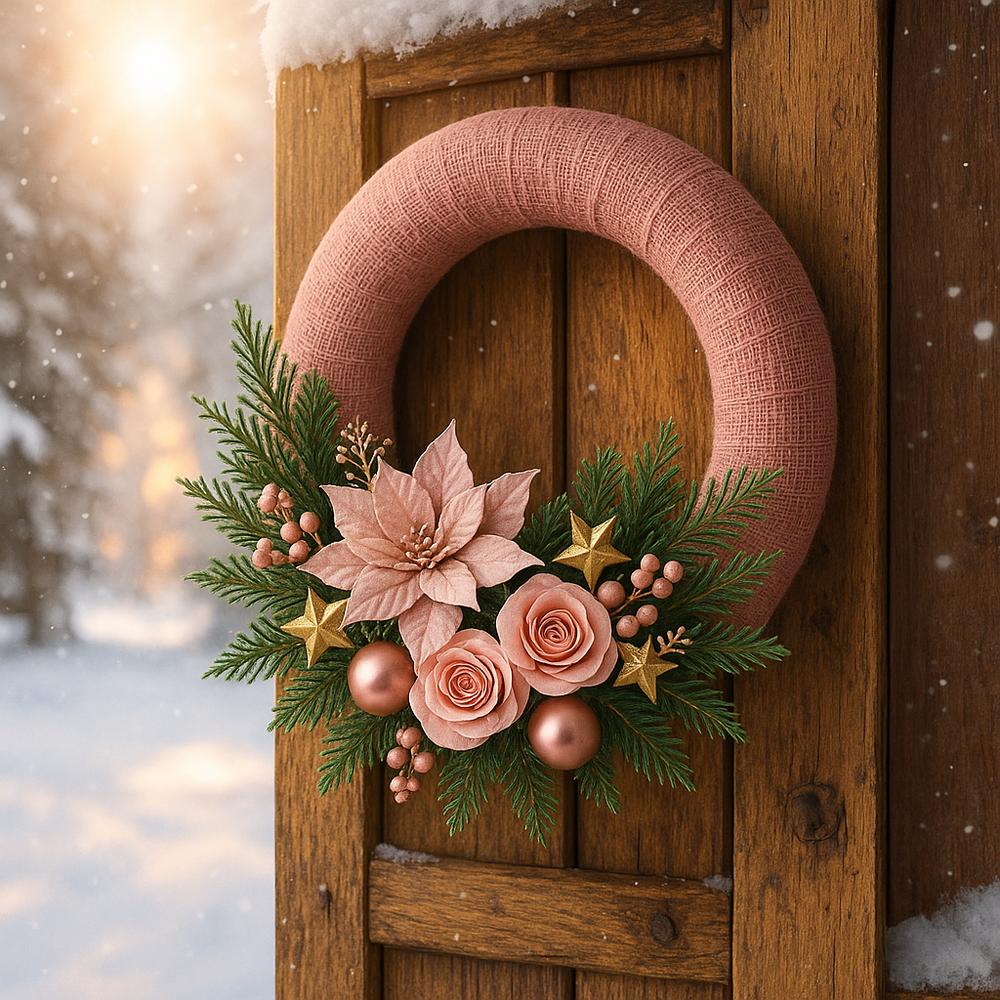 To ręcznie wykonana dekoracja, która łączy świeżość natury z subtelnym blaskiem świąt. Idealna do powieszenia na drzwiach, ścianie lub jako ozdoba stołu.