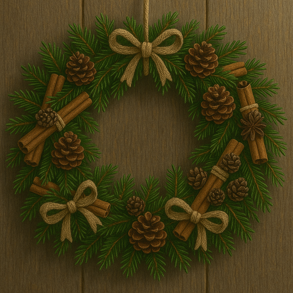 Ozdobiony został długimi laskami cynamonu wiązanymi jutowym sznurkiem, leśnymi szyszkami oraz kokardkami z juty, które podkreślają jego rustykalny styl. Całość utrzymana w stonowanej, naturalnej kolorystyce — zielenie, brązy i beże — idealnie wpisuje się w klimat zimowych i świątecznych aranżacji.