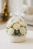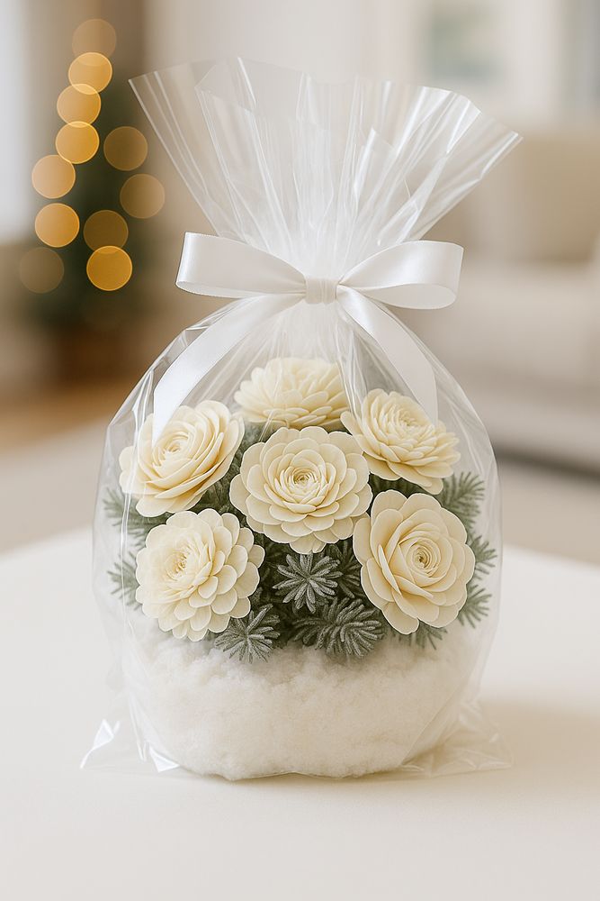 Elegancka świąteczna dekoracja wykonana z kremowych kwiatów shola, znanych z naturalnego wyglądu i subtelnej faktury. Ręcznie ułożone kwiaty tworzą harmonijną kompozycję w połączeniu z jasnymi, zimowymi gałązkami o delikatnym, oszronionym efekcie. Całość została osadzona na białej, miękkiej podstawie przypominającej świeży śnieg, dzięki czemu dekoracja zyskuje zimowy, lekko minimalistyczny charakter.