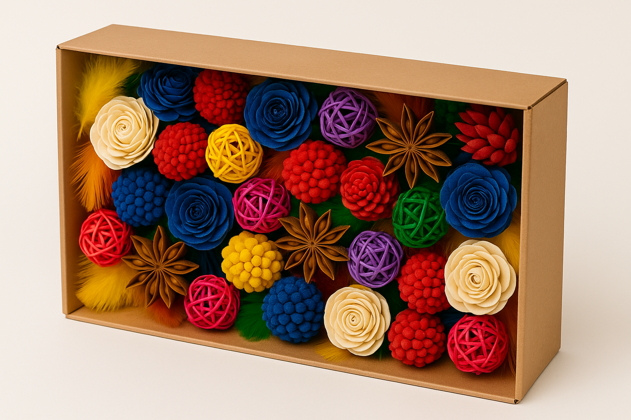 Gotowy mix elementów dekoracyjnych w żywych kolorach – idealny dla osób tworzących rękodzieło, stroiki, wianki, dekoracje stołowe, ozdoby sezonowe, projekty florystyczne, warsztaty artystyczne, zajęcia kreatywne, scrapbook, a także terapię zajęciową i arteterapię.