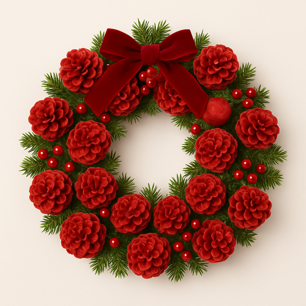 Zestawiaj czerwone szyszki z zielenią świerku, eukaliptusem lub mchem – uzyskasz elegancki, naturalny kontrast.