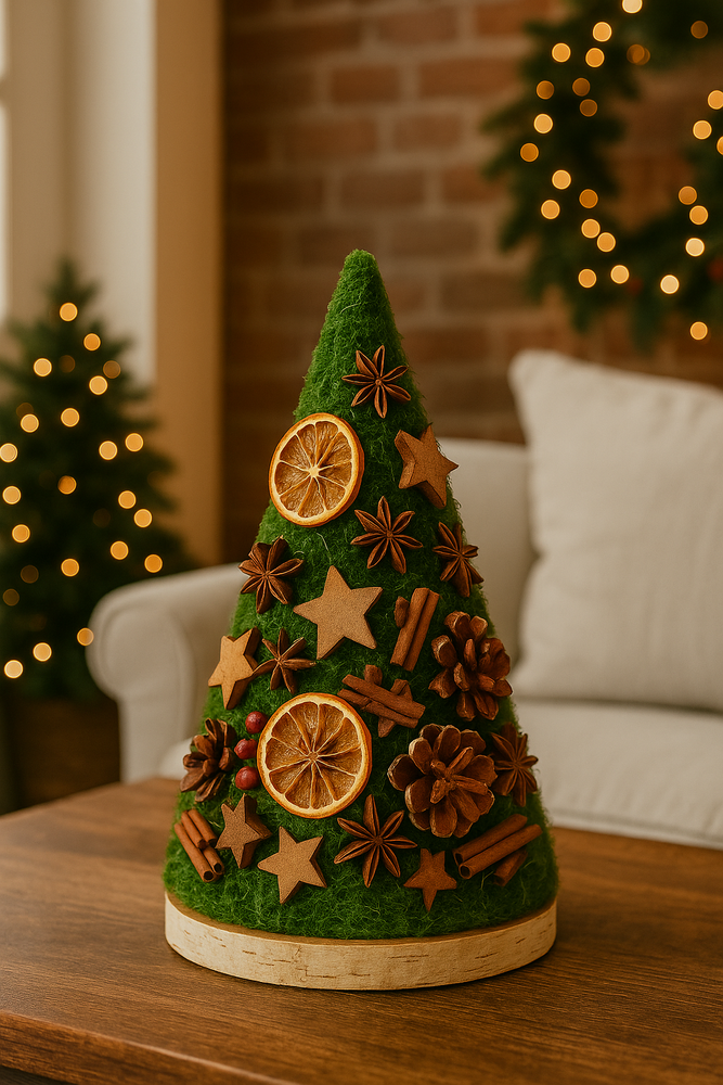 W zestawie znajduje się gotowa baza – solidna, stożkowa choinka pokryta miękkim, soczyście zielonym mchem oraz komplet naturalnych ozdób, dzięki którym stworzysz unikatową kompozycję dopasowaną do Twojego wnętrza. Projekt idealnie pasuje do stylu naturalnego, rustykalnego, boho, skandynawskiego, cottage czy świątecznego minimalizmu.