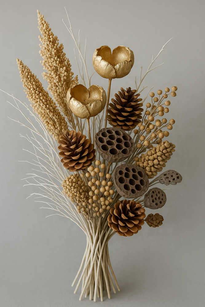 Utrzymany w ciepłej palecie beży i złota, doskonale wpisuje się w zimowe, świąteczne i całoroczne aranżacje. Bukiet jest gotowy do ustawienia w wazonie – prezentuje się luksusowo zarówno solo, jak i jako część większej kompozycji.