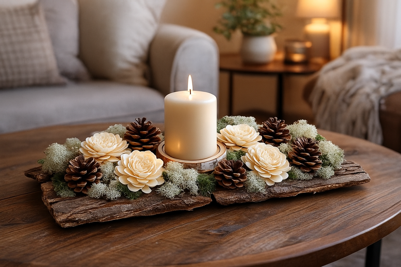 Ułóż płaty kory obok siebie, na środku postaw świecę, a wokół rozmieść kwiaty shola, mech i szyszki. Efekt będzie elegancki i minimalistyczny.
