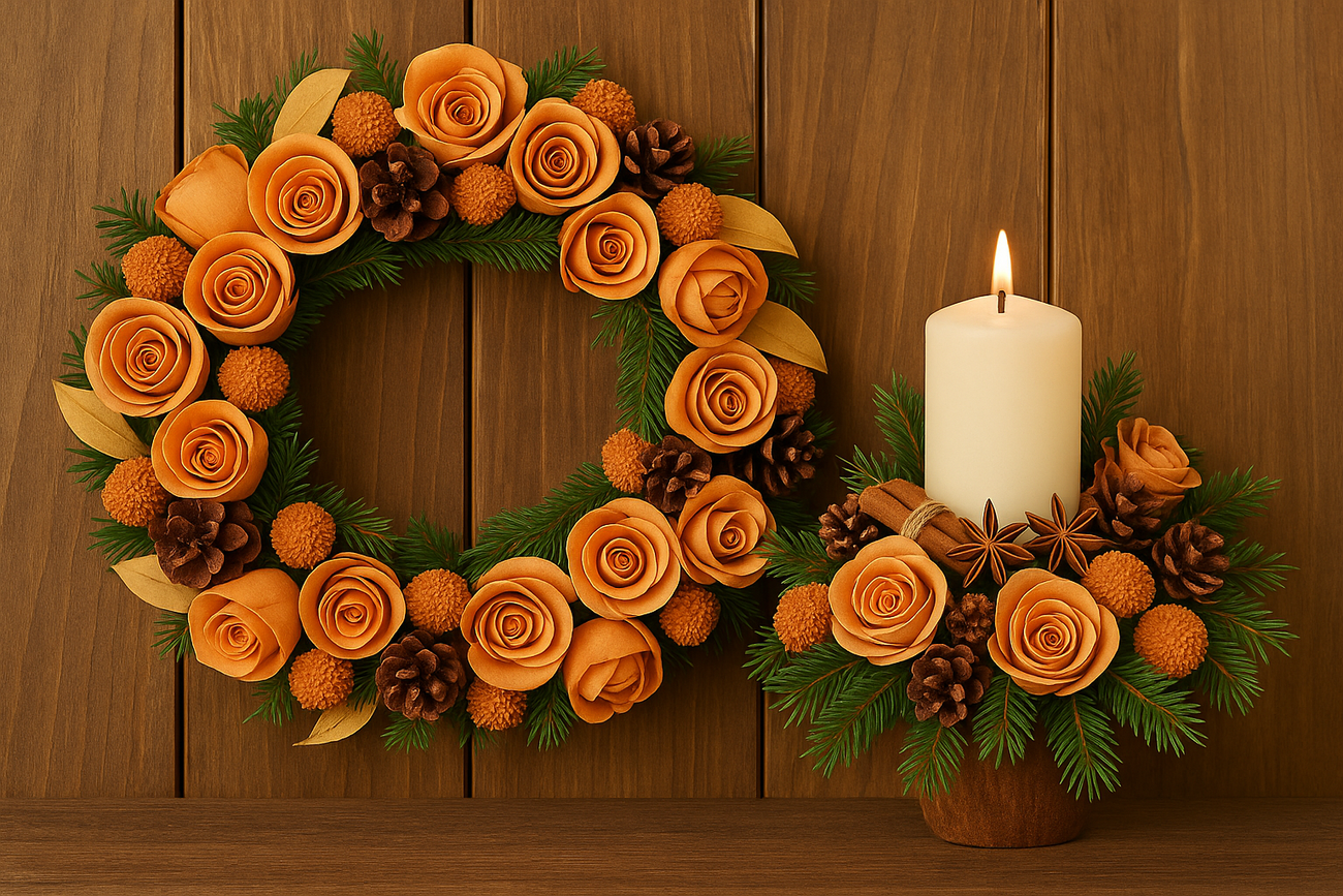 W komplecie znajdują się dwie ręcznie wykonane dekoracje: wianek na drzwi oraz stroik z świecą, utrzymane w harmonijnej kolorystyce głębokiej pomarańczy, zieleni igliwia i brązu naturalnych dodatków.