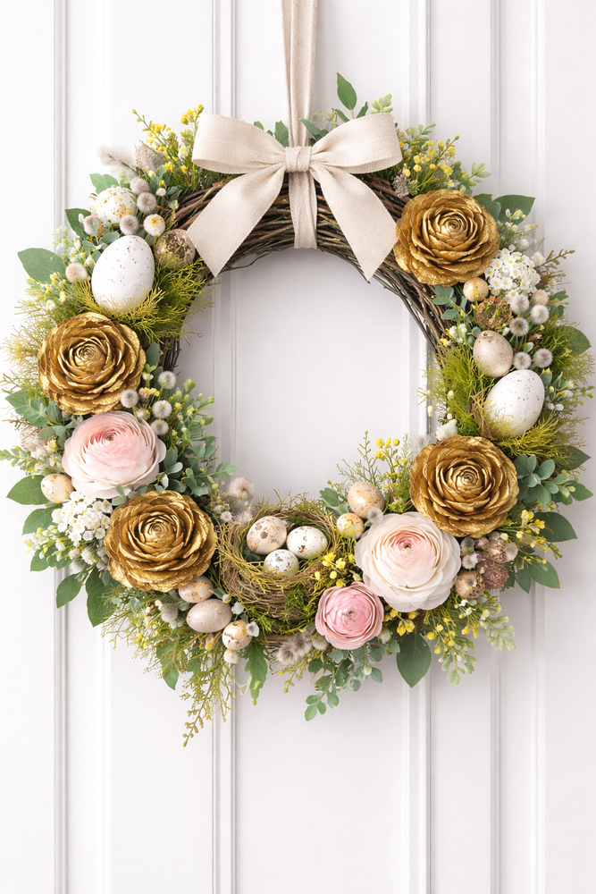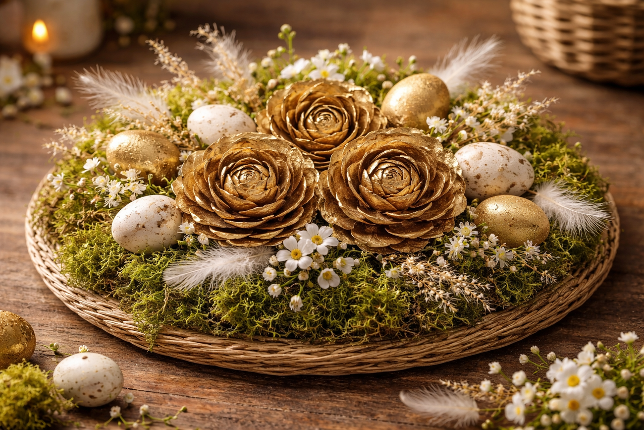 Zestaw 6 złotych róż cedrowych z kolekcji GrandDeco to elegancki element dekoracyjny, który łączy naturalną formę z odświętnym, subtelnym blaskiem złota. Róże wykonane z naturalnego cedru doskonale sprawdzają się w wielkanocnych aranżacjach – zarówno klasycznych, jak i nowoczesnych.