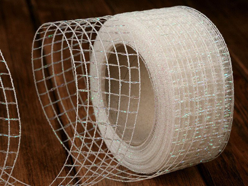 Wstążka świąteczna siatka biała z brokatowym połyskiem – szerokość 5 cm, długość 5 m