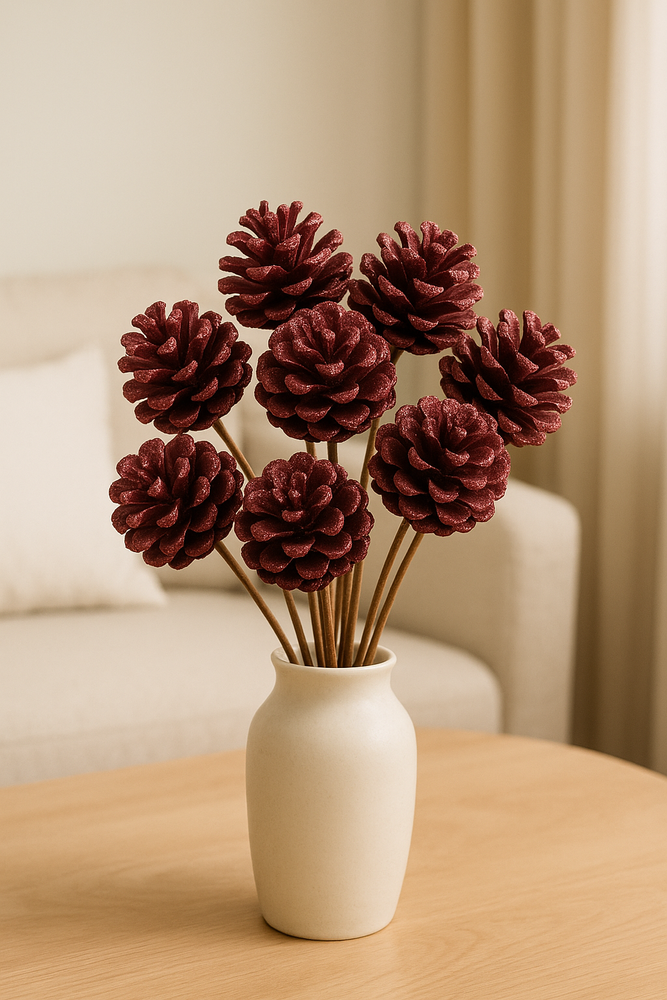 Elegancki bukiet dziewięciu dekoracyjnych szyszek w głębokim odcieniu bordo, lekko oprószonych brokatem, to idealny dodatek do świątecznych i zimowych aranżacji. Każda szyszka ma ok. 8 cm średnicy, dzięki czemu prezentuje się okazale i efektownie nawet w większych kompozycjach. Długi pik o długości ok. 40 cm zapewnia wygodne mocowanie w bukietach, stroikach i aranżacjach florystycznych.