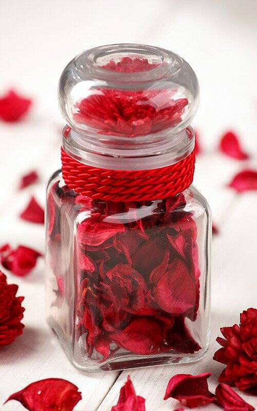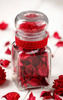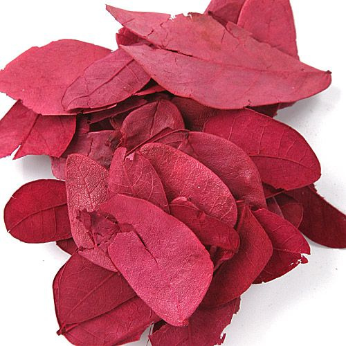 Suszone czerwone listki dekoracyjne, barwione w odcieniu bordo.