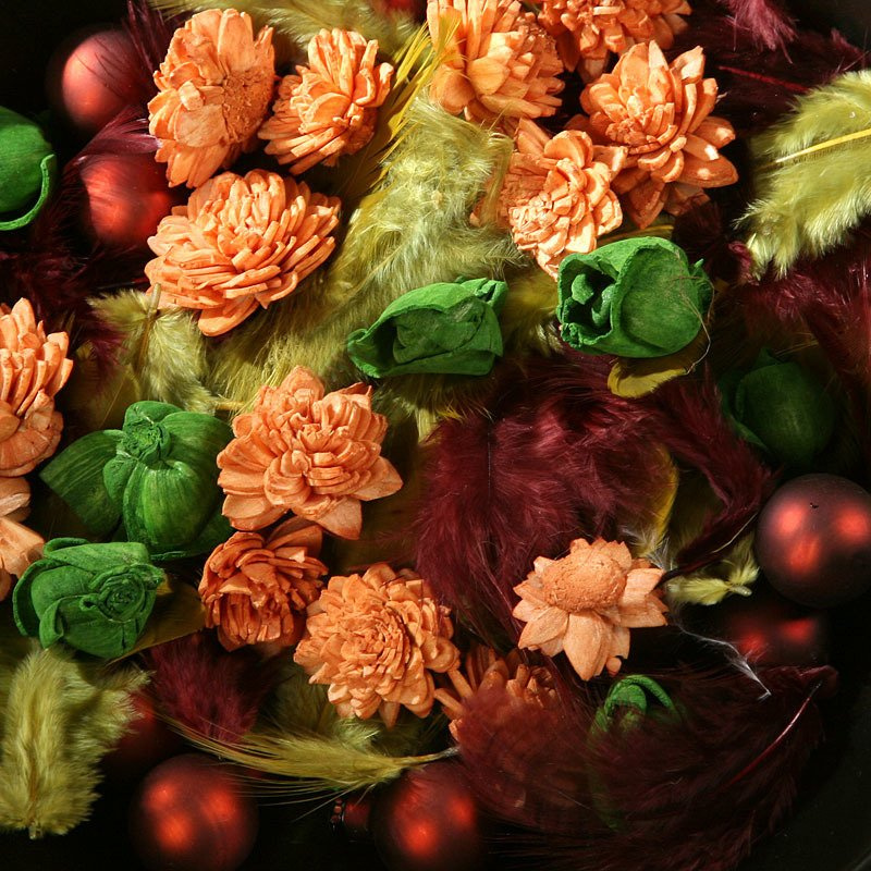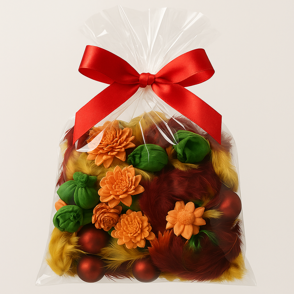 Wyrafinowana kompozycja suszonych kwiatów w intensywnych odcieniach pomarańczy, połączonych z ozdobnymi zielonymi pąkami, miękkimi piórkami w burgundzie i złocie oraz stylowymi bombkami. Zestaw łączy w sobie naturalność i szlachetną kolorystykę, tworząc efektowny akcent do wnętrz. Sprawdzi się jako oryginalny prezent, dekoracja salonu, sypialni lub stołu, a także baza do tworzenia własnych aranżacji – od stroików po świece i kompozycje zapachowe.