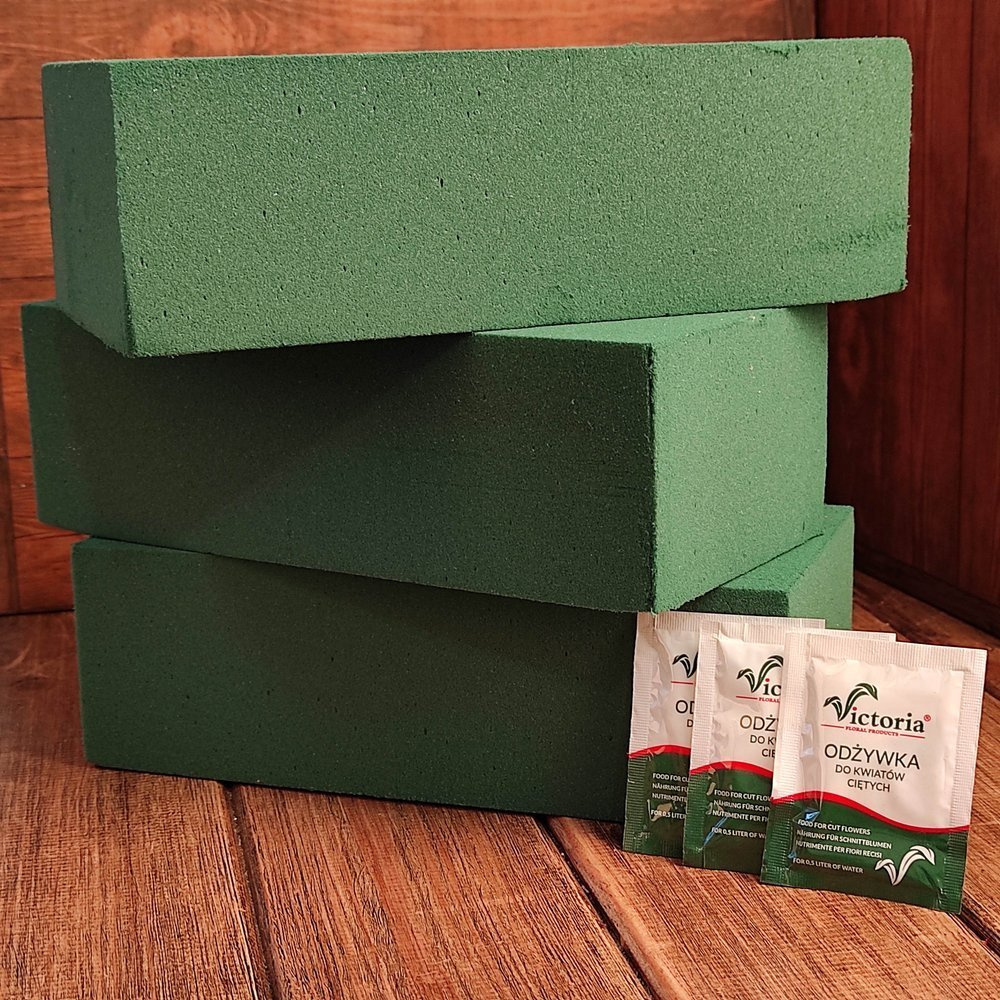 Zielona kostka do wbijania kwiatów to więcej niż tylko element dekoracyjny - to podstawa, która umożliwia stworzenie aranżacji o najwyższej jakości. A trzy kostki florystyczne z odżywkami wzmacniającymi działanie to gwarancja długotrwałego i świeżego wyglądu Twoich kwiatów.
